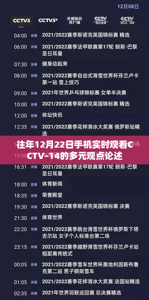 随着科技的飞速发展和互联网的普及,电视节目的观看方式也发生了翻天覆地的变化,尤其是临近年末,如往年12月22日这样的特殊日子,许多观众希望能够通过手机实时观看CCTV-14等电视频道,本文将探讨这一现象,阐述关于此观点的不同看法,以及个人立场和理由。
