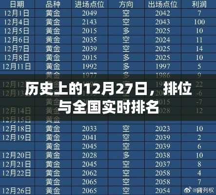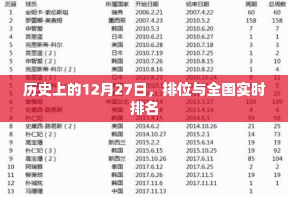 每年的12月27日,在历史的长河中都有着不同的意义,这一天或许曾经发生过重大事件,或许在某些年份中有着特殊的纪念意义,近年来随着信息技术的飞速发展,排位赛与全国实时排名等概念逐渐融入我们的生活,使得这一天也增添了一份竞技与激情,本文将探讨历史上的12月27日与排位全国实时排名之间的联系。