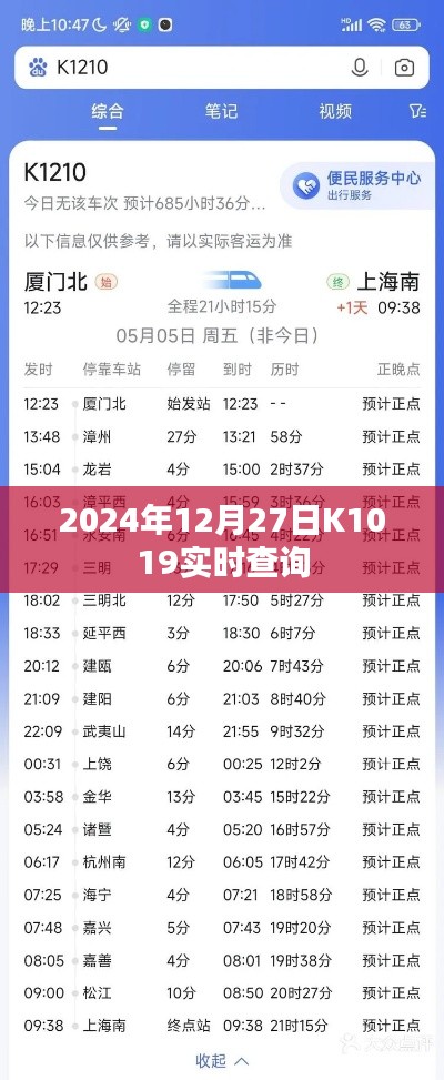 随着科技的飞速发展和互联网的普及,实时查询已经成为人们获取信息的重要途径,本文将为您提供关于2024年12月27日K1019实时查询的相关信息,以便您能够及时了解该班次的具体动态,为您的出行提供便利。