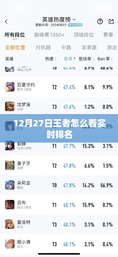 随着移动互联网的普及和电子竞技的飞速发展,王者荣耀已经成为了一款备受欢迎的MOBA手游,在这款游戏中,玩家可以体验到丰富的游戏内容、刺激的竞技氛围以及与其他玩家互动的乐趣,而在众多玩家中,实时排名则成为了衡量自身实力和水平的重要标准之一,本文将介绍在12月27日,玩家如何查看王者实时排名。