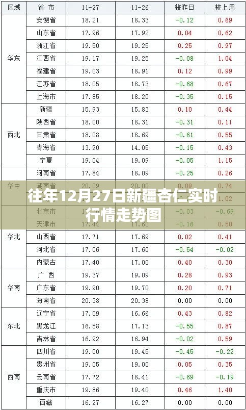 新疆,作为我国著名的干果产区,其杏仁品质优良、口感独特,备受国内外市场关注,每年的12月27日,新疆杏仁市场都会迎来一波新的行情走势,本文将从多个角度对往年12月27日新疆杏仁的实时行情走势进行深度分析,以期为相关人士提供有价值的市场信息。
