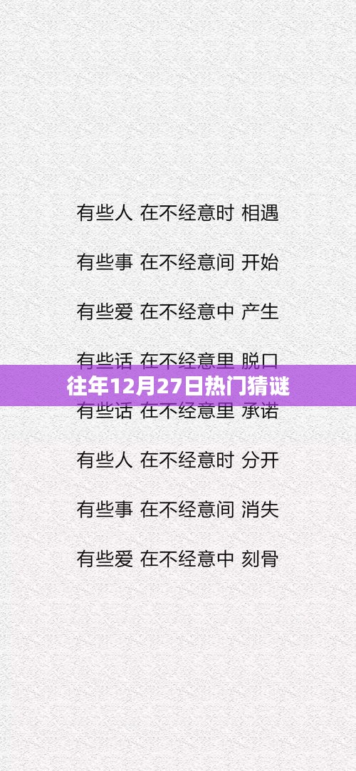 每年的12月27日,全球各地的猜谜活动如火如荼地进行着,这一天,人们热衷于挑战自己的智力和观察力,通过各种有趣的谜题寻找答案,本文将带你回顾往年12月27日的热门猜谜,感受猜谜的乐趣,同时分享一些经典谜题的解析。