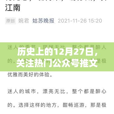 历史上的十二月二十七日承载着丰富的故事,通过关注热门公众号,我们可以轻松获取关于这一天的历史信息,了解背后的故事,让我们一起通过公众号推文,重温历史,感受那些伟大时刻的魅力。