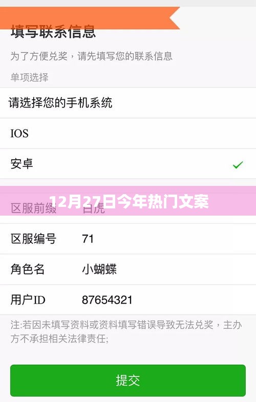 12月27日,这个特殊的日子让我们更加珍惜时光,回顾过去一年的点点滴滴,在这个辞旧迎新的时刻,让我们共同感受热门文案的魅力与氛围,期待更加美好的明天,让我们一起跨年狂欢,迎接新年的到来!