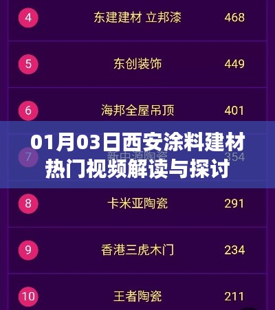 随着科技的飞速发展和互联网的普及,视频营销已成为各行各业宣传产品和服务的重要渠道之一,在涂料建材行业,热门视频更是引领市场潮流的风向标,本文将对《01月03日西安涂料建材热门视频》进行解读和探讨,带您了解这一领域的最新动态。