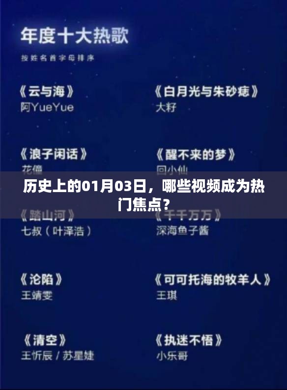 每年的每个月都有特定的历史事件发生,而其中的某一天可能因某个事件或人物而与众不同,在数字时代,随着互联网的普及和社交媒体的兴起,历史上的重要日子往往与热门视频紧密相连,本文将探讨历史上的01月03日,哪些视频因其独特内容、创新形式或社会影响力而成为热门视频。
