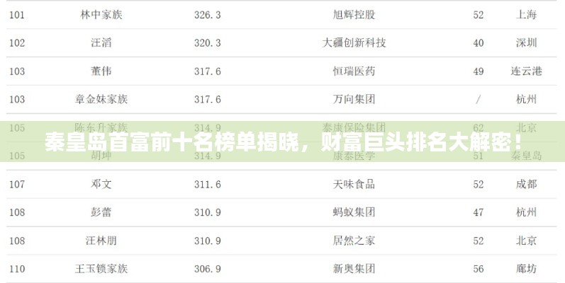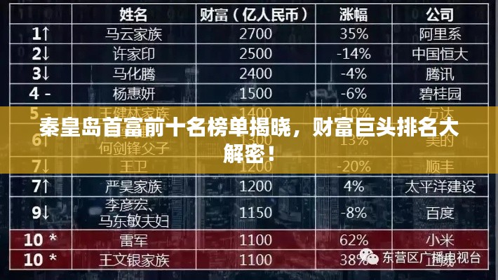 秦皇岛,这座美丽的滨海城市,近年来经济发展迅速,吸引了众多企业家和投资者的目光,随着经济的繁荣,秦皇岛的首富们也在各自的领域取得了骄人的成绩,本文将为您揭示秦皇岛首富前十名的排名,带您了解这些成功人士的传奇故事。