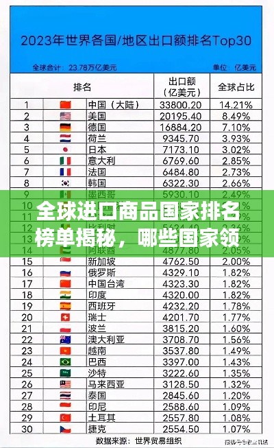 随着全球化的不断发展,国际贸易日益繁荣,各国之间的商品交流愈发频繁,在此,我们根据最新的数据,揭示世界商品进口国家的排名表,探讨其背后的原因及影响因素,并展望未来的发展趋势。