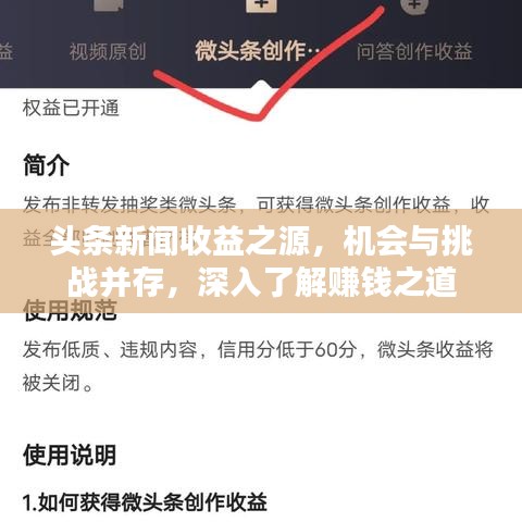 头条新闻赚钱的机会与挑战并存,对于想要通过头条新闻赚钱的人来说,需要不断提高内容质量,保持高度敏锐的市场洞察力,同时遵守平台规则,加强自律,只有这样,才能在头条新闻市场中获得长期稳定的收益。