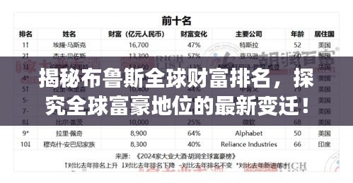 在全球经济不断变化的背景下,富豪们的排名也随之波动,对于关注全球富豪榜单的人来说,了解这些变化可以让我们更好地了解全球经济的变化趋势和商业领域的发展状况,布鲁斯作为商业领域的杰出人物,其成功经验和创业历程也值得我们学习和借鉴。