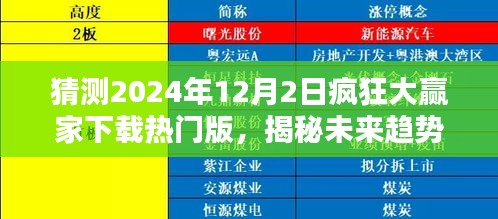 随着科技的飞速发展和数字娱乐产业的持续繁荣,我们即将迎来一个激动人心的时刻——2024年12月2日,这一天,我们将见证一个全新的里程碑,那就是“疯狂大赢家下载热门版”的崭新面世,让我们一起走进这个充满无限可能的数字世界,猜测并探讨它在未来的发展趋势和可能带来的影响。