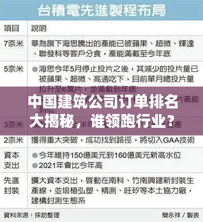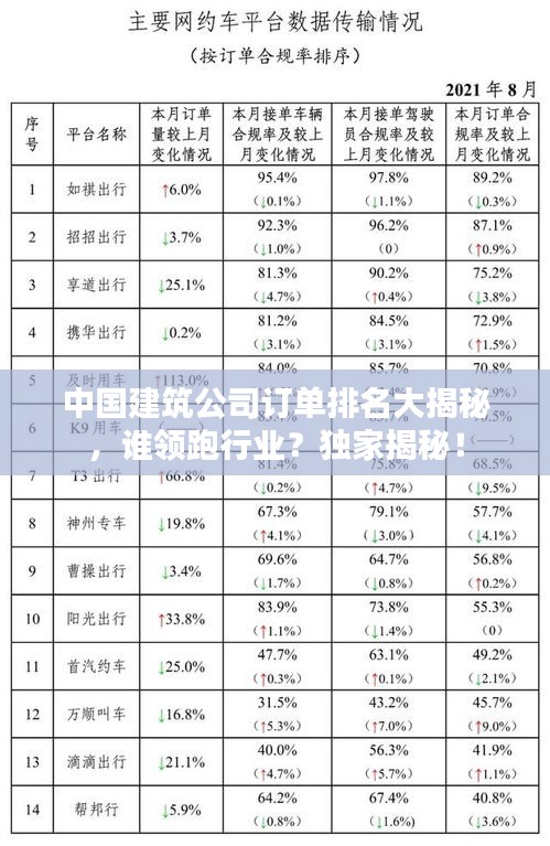 随着国家经济的蓬勃发展,建筑行业作为国民经济的支柱行业之一,持续保持稳健增长态势,众多建筑公司在激烈的市场竞争中各显神通,争夺市场份额,本文将为您揭示中国建筑公司的订单排名,带您了解哪些公司在激烈的市场竞争中脱颖而出。