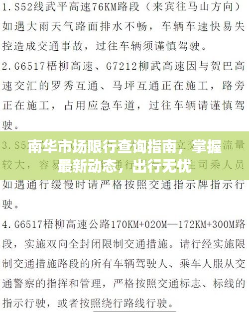 为了更好地了解南华市场的限行情况,市民和游客可以通过多种途径获取最新信息,遵守交通规则,选择合适的出行方式,还可以关注其他区域的限行规定和实时路况,为出行提供便利。