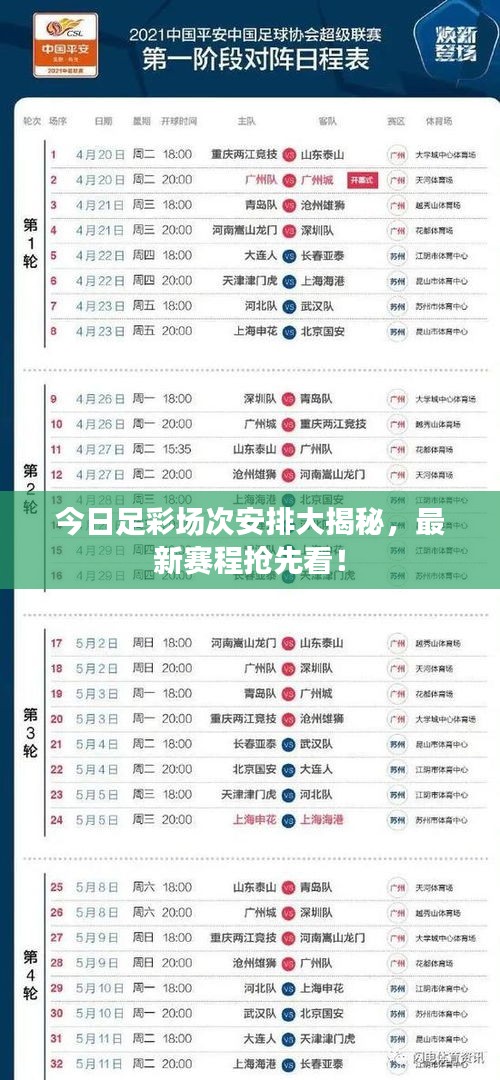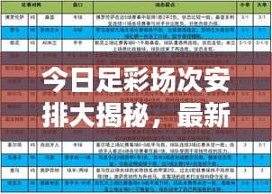 足球彩票作为一种独特的体育娱乐方式,吸引了无数球迷和投资者的关注,随着科技的进步和信息的透明化,越来越多的人通过关注最新的足彩场次安排来参与这场充满刺激与乐趣的游戏,本文将为您带来最新的今日足彩场次安排,让您轻松掌握比赛动态,为自己的决策提供参考。