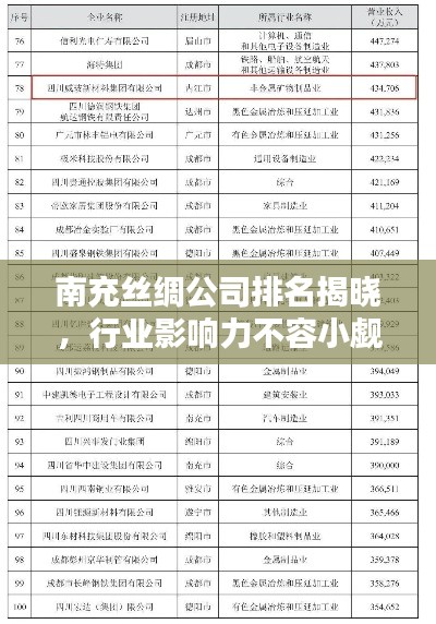 南充,作为中国的丝绸之都,拥有悠久的丝绸文化和丰富的产业资源,随着时代的发展,南充丝绸行业不断壮大,众多丝绸公司崭露头角,本文将探讨南充丝绸公司的排名及其行业影响力,以揭示这一行业的蓬勃发展态势。