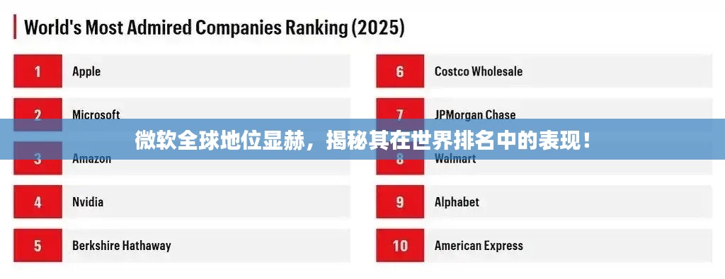 微软在全球范围内的排名十分靠前,其在操作系统、办公软件、云计算和人工智能等领域均保持领先地位,作为全球科技巨头,微软的影响力渗透到各行各业,为推动全球科技发展作出重要贡献,面对激烈的市场竞争和技术变革,微软仍需不断创新,以应对未来的挑战。