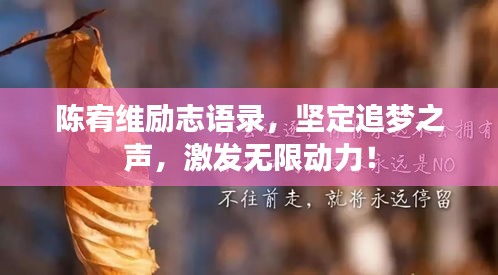 在这个充满挑战与机遇的时代,许多人都在为了自己的梦想而奋斗,陈宥维,一位优秀的青年艺人,以其坚定的信念和不懈的努力,成为了众多年轻人的榜样,他的励志语录,充满了对梦想的追求、对人生的思考和对挑战的勇气,激励着一代又一代的年轻人勇往直前。