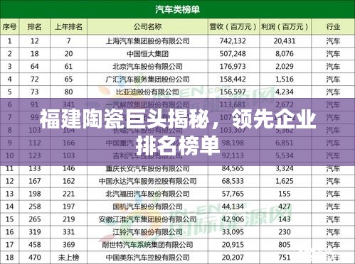 福建,这片繁荣的土地,自古以来便是陶瓷艺术的摇篮,这里,陶瓷文化深厚,技艺传承千年,随着时代的发展,福建陶瓷产业更是蓬勃发展,涌现出了一批实力雄厚、影响力广泛的陶瓷企业,我们将为您揭晓福建陶瓷最大公司的排名。