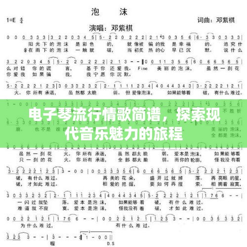 随着现代音乐文化的飞速发展,电子琴音乐已经成为流行情歌创作的重要载体之一,电子琴以其独特的音色和演奏方式,为流行情歌注入了新的活力,本文将围绕“电子琴音乐流行情歌简谱”这一主题,探讨电子琴在现代音乐领域的应用及其魅力。