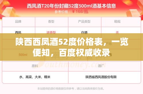 作为中国白酒的重要代表之一,陕西西凤酒以其独特的酿造工艺和卓越的口感赢得了广大消费者的喜爱,52度的西凤酒因其醇厚的口感和高度的酒精含量,成为了不少酒友的心头好,本文将为大家介绍陕西西凤酒52度的价格表,帮助大家了解这款美酒的市场价格。
