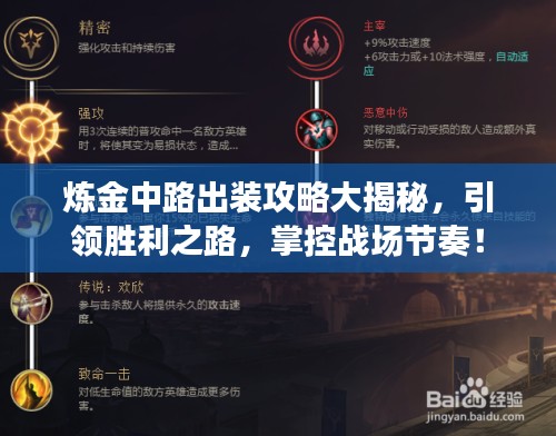 炼金中路出装攻略需要根据英雄特性和敌方阵容进行灵活调整,通过本文的介绍,希望玩家们能够更好地掌握炼金英雄的特点和出装技巧,从而在战场上取得优势,引领胜利之路。