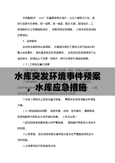 水库作为我国重要的水资源储备设施,对保障供水、发电、防洪等方面具有重要作用。然而,水库在运行过程中可能因自然或人为因素发生突发环境事件,如溢洪、泄洪过程中的水质污染、生态系统破坏等。为了有效应对这些突发环境事件,确保人民生命财产安全和社会稳定,制定水库突发环境事件预案显得尤为重要。