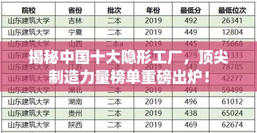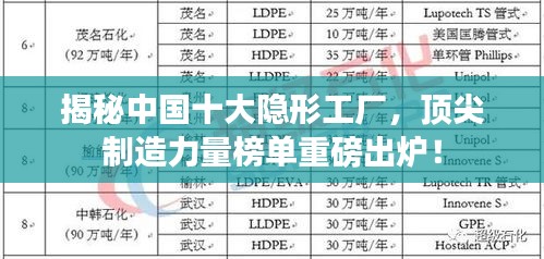 随着制造业的飞速发展,中国涌现出了一批实力强大的隐形工厂,这些工厂在各自的领域内独领风骚,成为国内外同行瞩目的焦点,本文将为您揭示中国隐形工厂排名前十名,带您领略国内顶尖制造力量。