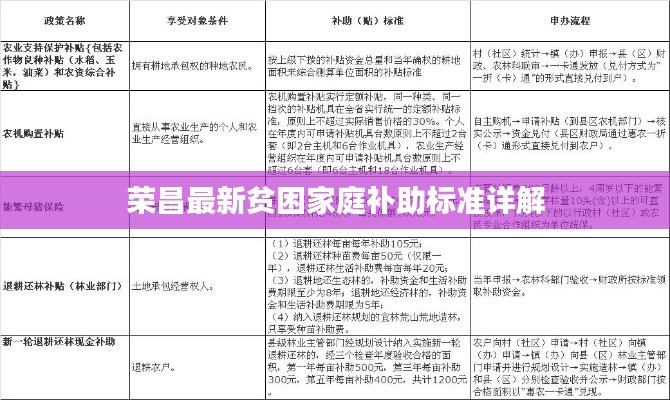 近年来,随着国家对扶贫工作的深入推进,各地纷纷出台了一系列扶贫政策,旨在帮助贫困家庭摆脱困境,实现全面发展,荣昌作为重要的地区之一,其针对贫苦家庭的补助标准也备受关注,本文将对荣昌贫苦家庭补助标准的最新情况进行详细解析,以帮助读者更好地了解当地扶贫政策。