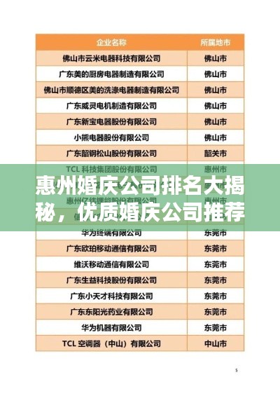 随着现代婚礼的多样化需求增长,惠州婚庆市场逐渐繁荣,各类婚庆公司如雨后春笋般涌现,本文将为您介绍惠州婚庆公司的排名,以帮助新人新婿们选择最适合自己的婚礼策划团队。