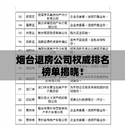 随着烟台房地产市场的不断发展,退房公司作为一个新兴的服务行业也逐渐崭露头角,本文将介绍烟台退房公司的排名,为广大业主提供一份参考。