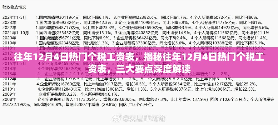 每年的12月4日,随着年终财务结算的临近,个税工资表成为广大职工关注的焦点,一份合理的个税工资表不仅关乎每位员工的切身利益,更是企业财务管理透明度的体现,本文将带你深入了解往年12月4日热门个税工资表的三大要点,助你更好地把握个人权益,合理规划财务未来。
