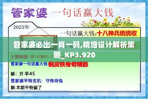 “管家婆必出一肖一码,精细设计解析策略_KP3.920”是一种基于数据分析和概率计算的彩票投注策略,虽然它可能提高中奖概率,但存在很大的不确定性,更重要的是,任何涉及彩票的策略都必须遵守当地的法律法规,避免陷入法律风险,博彩者在采用此类策略时,应保持理性和谨慎,不应忽视彩票投注中固有的风险,对于所谓的“管家婆”,更应注重合法合规,积累智慧和经验,以合法的方式为玩家提供服务。