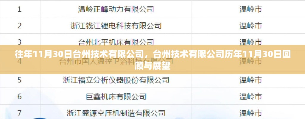 台州技术有限公司在历年的发展中取得了显著的成果,这些成果离不开公司全体员工的辛勤付出和社会各界的支持,未来的道路仍然充满挑战与机遇,台州技术有限公司将继续坚持创新、卓越、合作、责任的核心价值观,为实现更加辉煌的未来而努力,每年的11月30日,都是公司发展的重要节点,让我们共同期待台州技术有限公司在未来的日子里取得更加辉煌的成就。