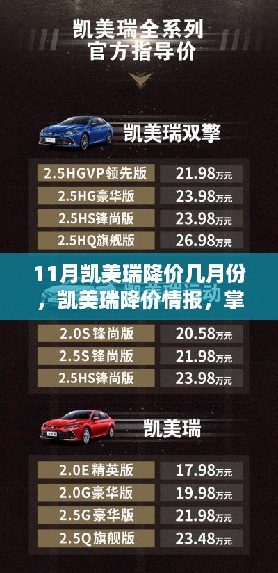 购车好时机来临,掌握凯美瑞降价信息,轻松成为车主!随着季节的更迭,车市也迎来了新的变化,本文将指导您如何获取关于“11月凯美瑞降价几月份”的准确信息,助您轻松掌握购车良机,无论您是初学者还是进阶用户,本文都能为您提供必要的购车指南,请跟随我们的步骤,成为最聪明的购车者!