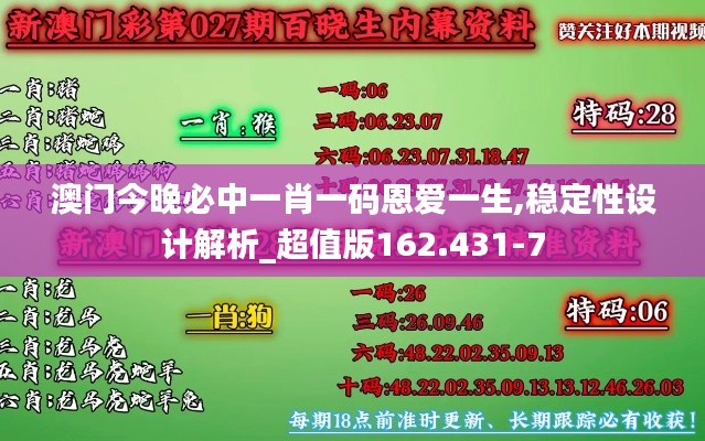 基于稳定性设计解析,结合超值版162.431-7的规则,我们可以制定一套澳门今晚必中一肖一码恩爱一生的策略。首先,我们要保持冷静的头脑和稳定的情绪,不要被游戏中的刺激和紧张所影响。其次,我们要认真观察游戏的走势和变化,从中找出游戏的规律和特点。然后,我们要根据游戏的规则和自身的实际情况,选择合适的投注方式和金额,并合理安排投注的时间和节奏。最后,我们要保持乐观和积极的态度,相信自己的判断和选择,不惧困难和挑战。只要我们坚持这套策略,澳门今晚必中一肖一码恩爱一生就不是梦。