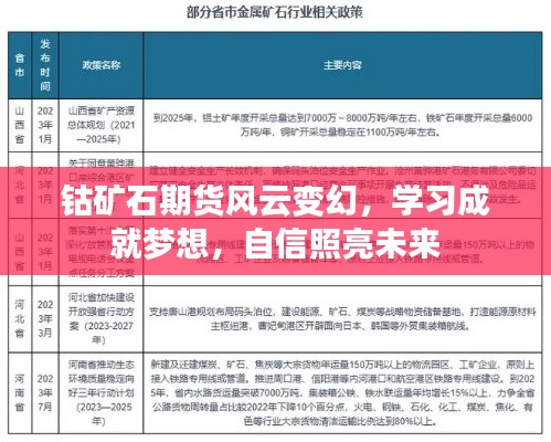 钴矿石期货市场的实时行情告诉我们:变化是生活的常态,我们要学会接受和适应变化,只要我们保持学习的态度,勇敢面对挑战,抓住机遇,发挥自己的优势,就一定能够实现自己的梦想,让我们在市场的变幻中成就梦想,用自信照亮未来!